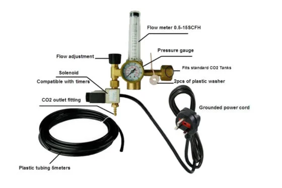 The CO2 regulator comes with 5 meters of plastic tubing. We reccomend attaching this to the back of an oscillating fan to guarantee even dispersion. It also comes with two spare washers. We reccomend replacing the washer every time the regulator is attached to a new bottle.