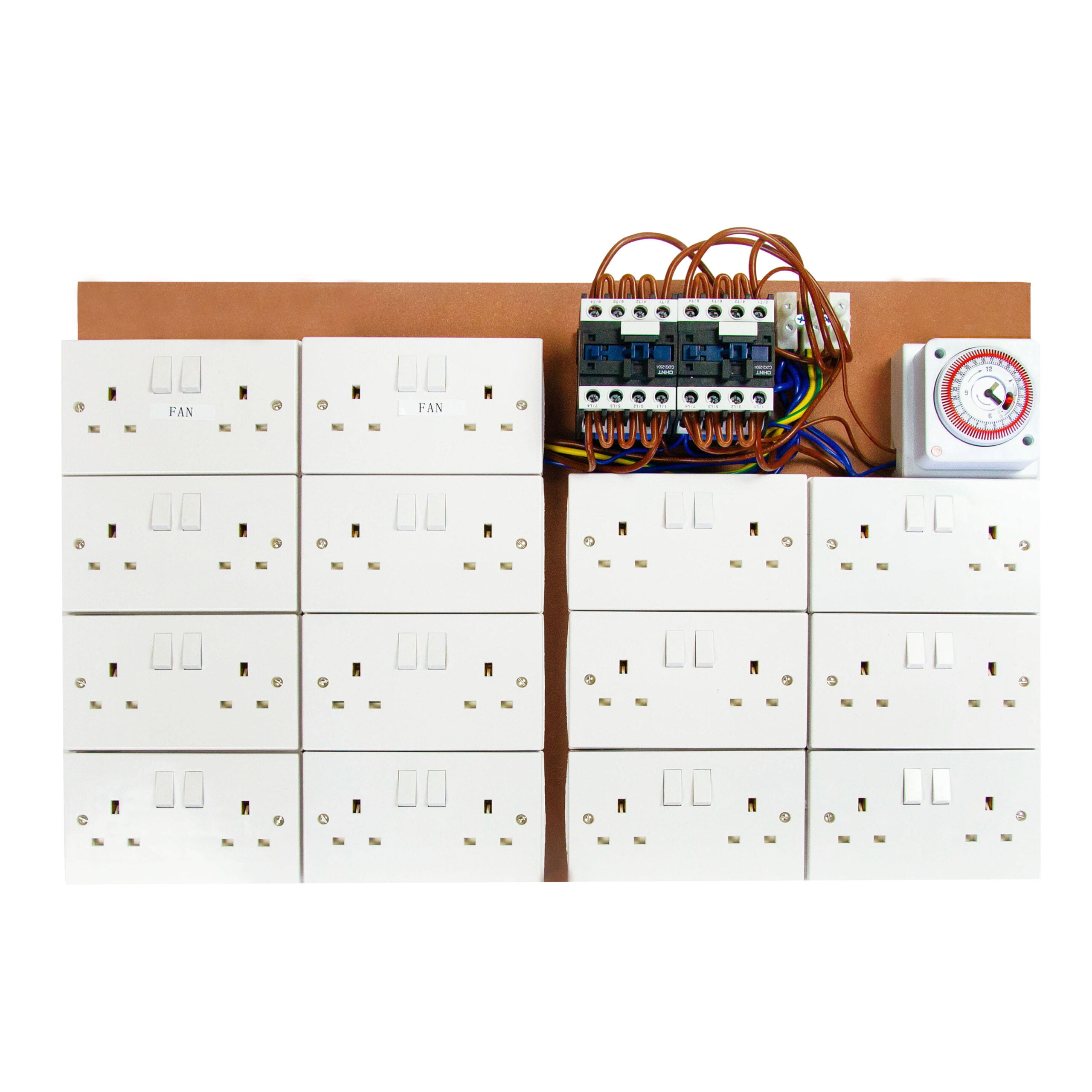 This 24-Way Contactor Board comes with a professional Analogue Timer for setting power loads as and when required! It is mounted with MDF board which has room in the corners to fix to the wall. The quality 24 hour mechanical timer won’t let you down!