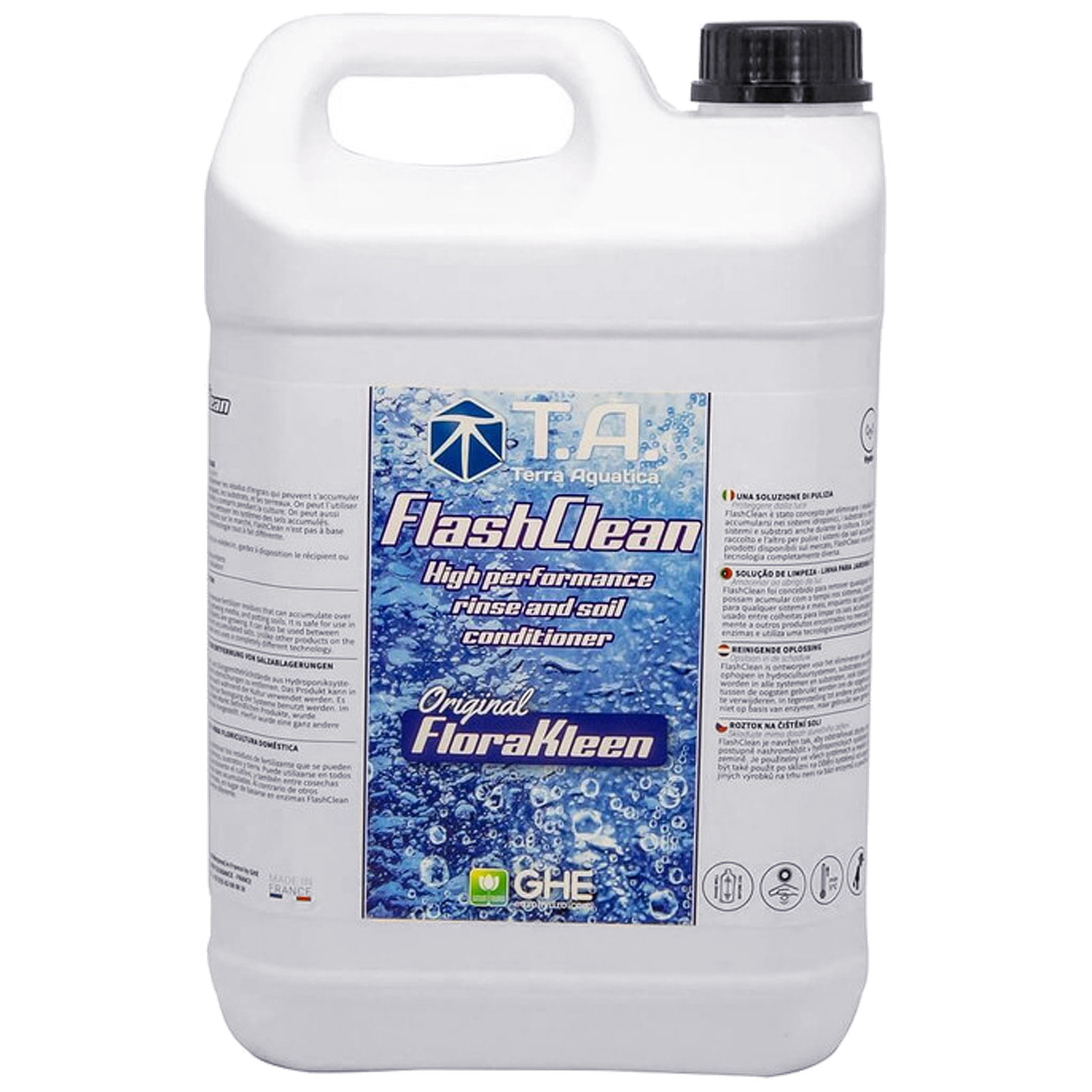 Mineral feeds can leave salts deposits on grow-mediums like clay pebbles and also within coco, soil, perlite etc. These deposits can also clog parts of hydroponics systems like drip-lines and draining pipes. Salt deposits in grow-media cause a great deal of stress to the plant and can cause nutrient lockouts to occur, not to mention a slow-down or stalling in growth. When salts clog up a hydroponics system, it can reduce the lifespan of pumps, drip-lines and drainage pipes and can cause a failure of the system leading to plant death. Terra Aquatica FlashClean dissolves mineral precipitation, deposits and residues out of any grow-medium and any grow system helping to keep it running exactly as it should. In this way it reduces plant stress and the likelihood of nutrient lockouts. Terra Aquatica FlashClean does not use enzymes like many other cleaning products. It achieves it’s goal utilising a completely different technology. FlashClean can also be used as a flushing agent to clear out nutrients towards the end of a grow and to encourage the plant to transport it’s sugars to it’s flowers and fruits.