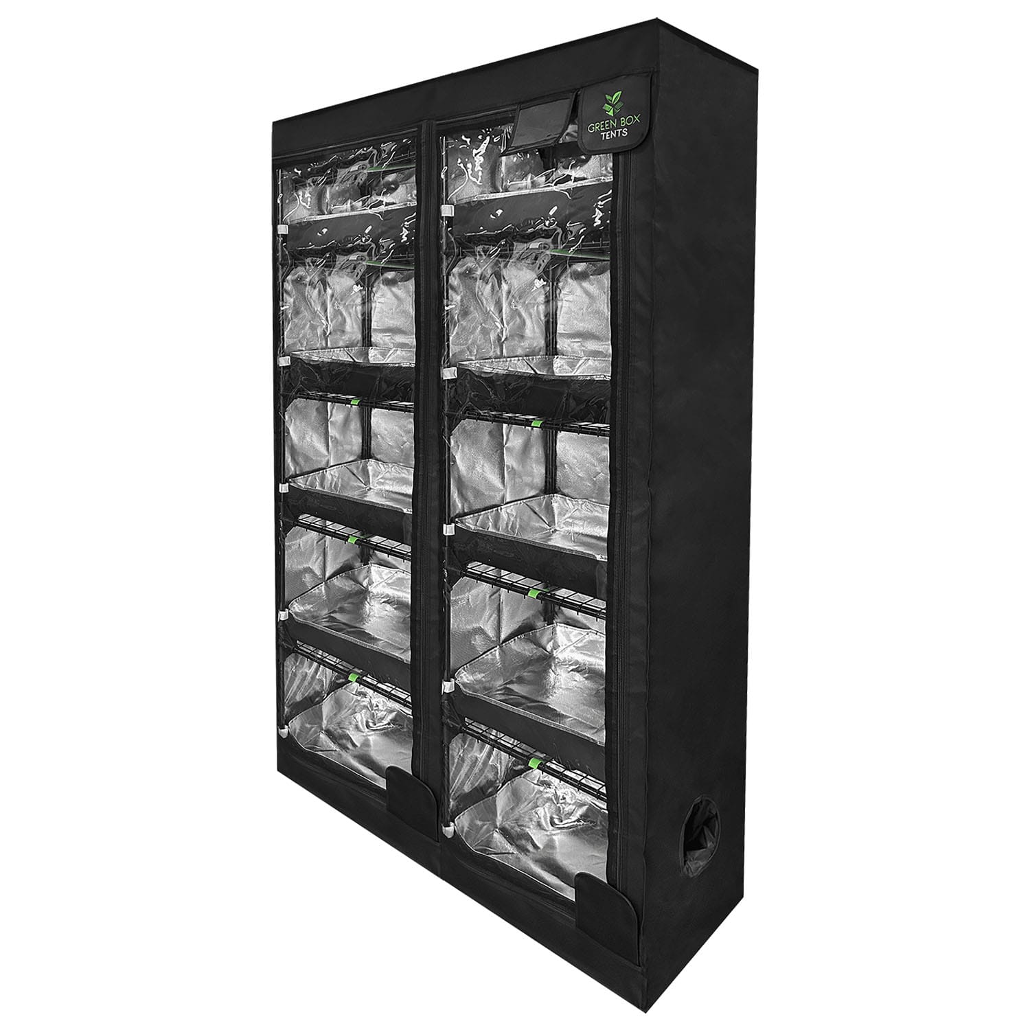 Our Propagation tents are perfect for seedlings, early veg & full life-cycle of short plants. They feature sturdy shelves with individual drip trays and shelf hangers as well as clear doors for easy viewing, without disturbing the temperature or humidity of the grow environment.