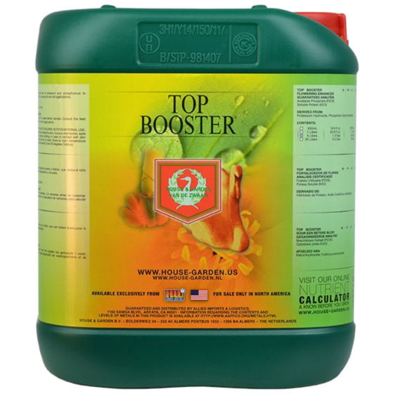 House & Garden Top Booster is an excellent flowering booster for use in addition to the other products in the House & Garden range. Top Booster contains easily absorbable forms of phosphorous and potassium to considerably increase the number of bud-sites and the final weight and quality of your harvest.