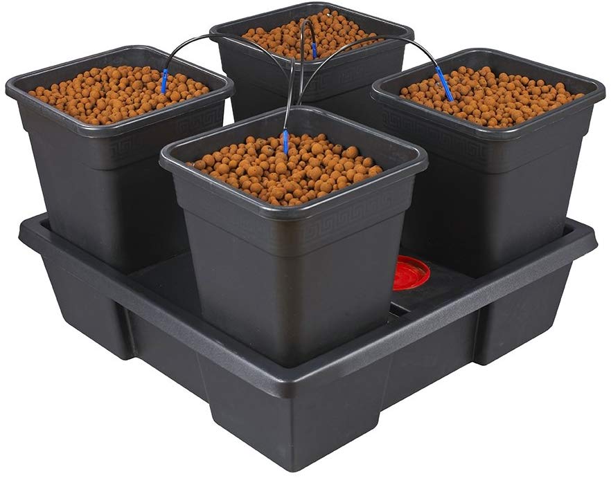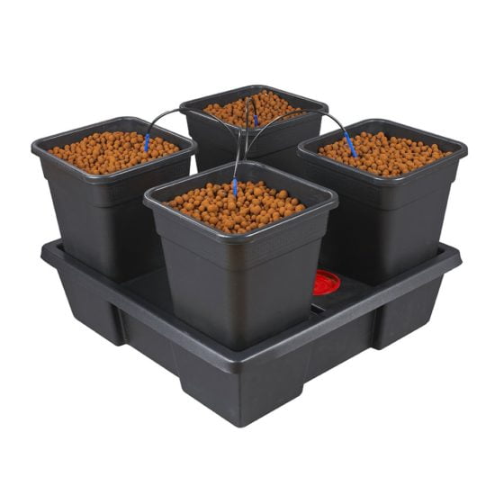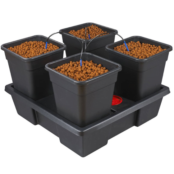 The 4 pots are filled with your chosen growing medium, you set the timer to the desired feeding duration and frequency, and a pump delivers nutrient solution through the drippers into the pots. Perfect if you want the familiarity of pots and the increased yields produced by plants fed little and often.