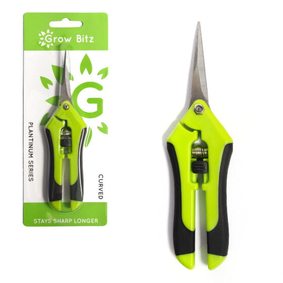 Grow Bitz Platinum Curved Scissors are curved trimming scissors with spring-loaded action and curved razor blades to ensure easy use. They are a must-have accessory for every grower and great when it comes to trimming plants during harvest. These scissors are ultra lightweight and are anti-slip for comfortable, prolonged grip. They also come with a safety lock for when not in use, and are resin and sap corrosion resistant. Made of durable stainless steel, these scissors are suitable for any stem, soft or hard.