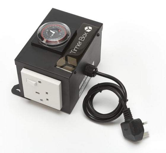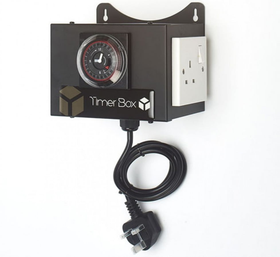 This 2-plug version of the Timer Box can power 2 lights of up to 1000 watts, as well as being able to handle any combination of lights (e.g. 1000w/600w, 600w/600w, 1000w/250w etc.) Each plug has its own built-in switch too, so any light can be controlled separately from the others. A robust hanging bracket is also included, allowing you to mount the Timer Box securely either on a wall or other suitable area.